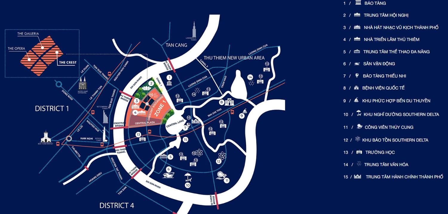 The Opera Residence sở hữu khả năng kết nối vượt trội nhờ vị trí trung tâm đắc địa tại khu đô thị mới Thủ Thiêm, giúp cư dân dễ dàng tiếp cận hàng loạt địa điểm quan trọng của TP. Hồ Chí Minh:
